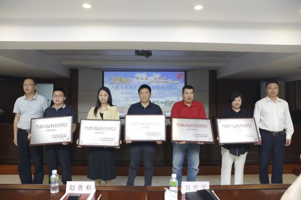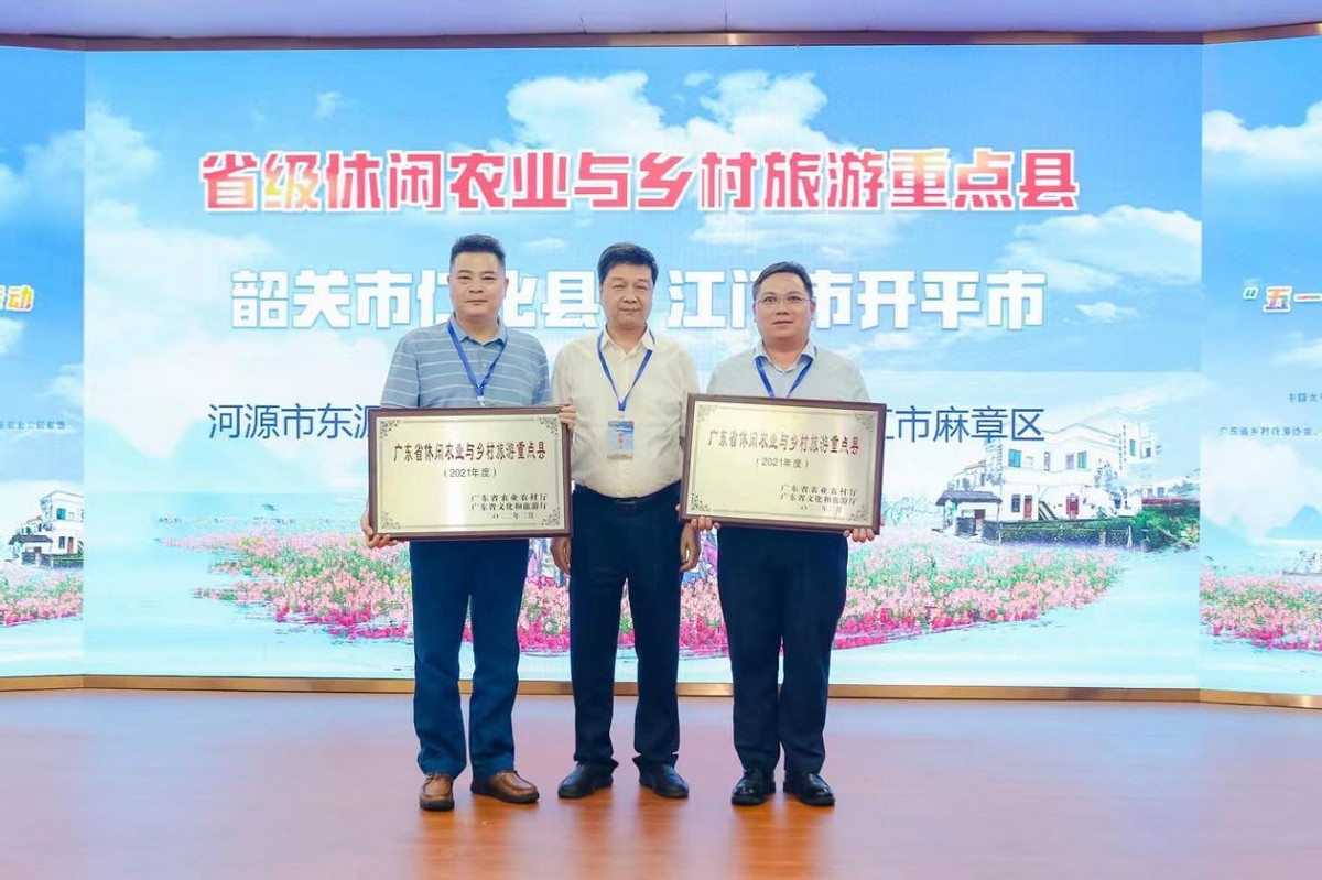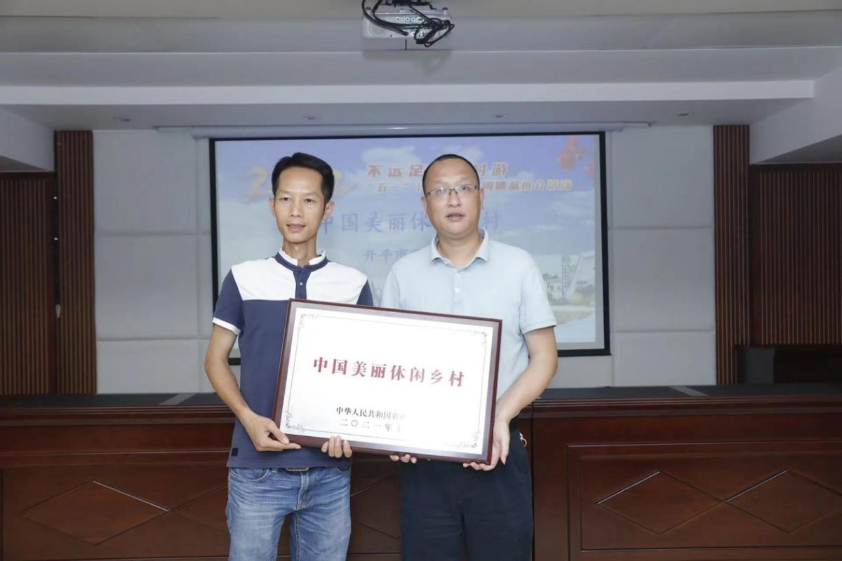 广州主会场上进行了2021年度省级以上乡村休闲示范单位授牌仪式。广东省农业农村厅二级巡视员廖纪坤向江门市开平市政府张伟业副市长颁发了《2021年度广东省休闲农业与乡村旅游重点县》牌匾。