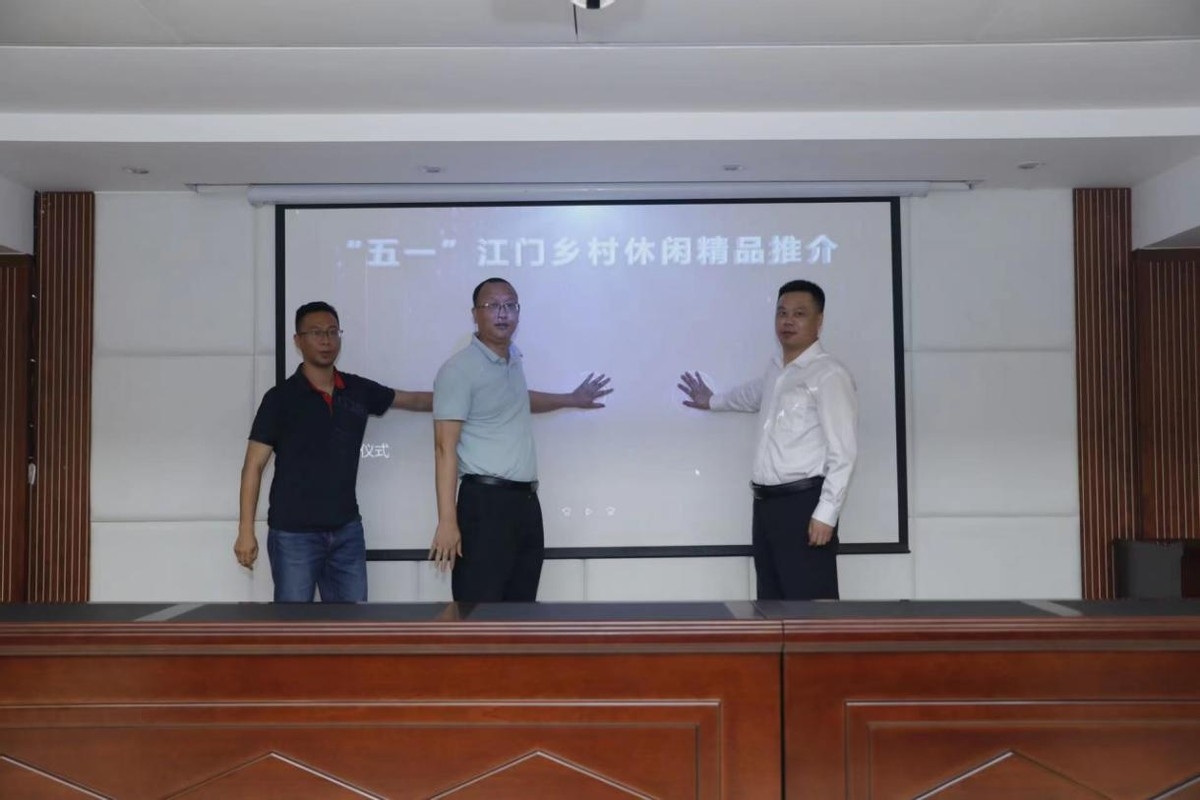 其后,江门农业农村局的副局长赵善和、江门农商银行党委副书记万世平和广东经济科教频道广东社区副主任周密共同启动了“五一”江门乡村休闲精品推介活动。