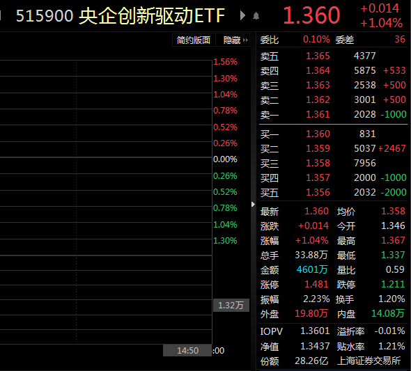 截至发稿,央企相关ETF普涨,多只EF涨超1%。其中,央企创新驱动ETF(515900)成交额4678万元,涨1.04%。