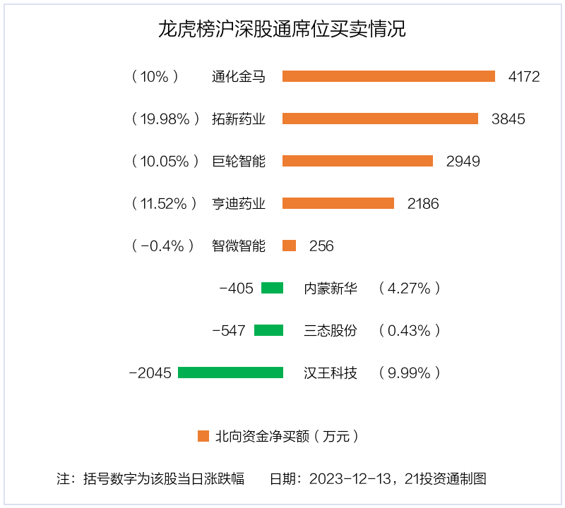 12月13日,上证指数下跌1.15%,深证成指下跌1.54%,创业板指下跌1.66%。盘后龙虎榜数据显示,共有43只个股因当日异动登上龙虎榜,资金净流入最多的是巨轮智能(002031.SZ),达2.29亿元。