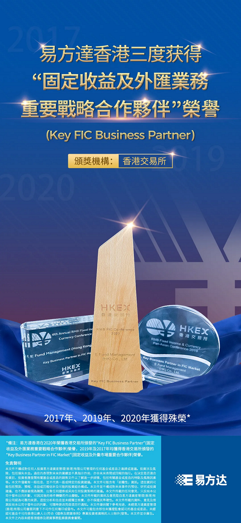 为感谢易方达资产管理(香港)有限公司(“易方达香港”)长期以来对香港交易所(“港交所”)固定收益和外汇业务的大力支持,港交所第三次授予易方达香港“固定收益和外汇业务重要战略合作伙伴”(Key FIC Business Partner)的荣誉。