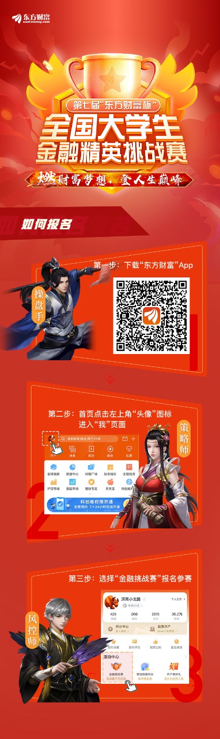 第七届“东方财富杯”全国大学生金融精英挑战赛分为校赛、省赛和国赛三个阶段。参赛学生及团队使用大赛专用平台“东方财富”APP,以沪深上市的A股品种进行比拼。