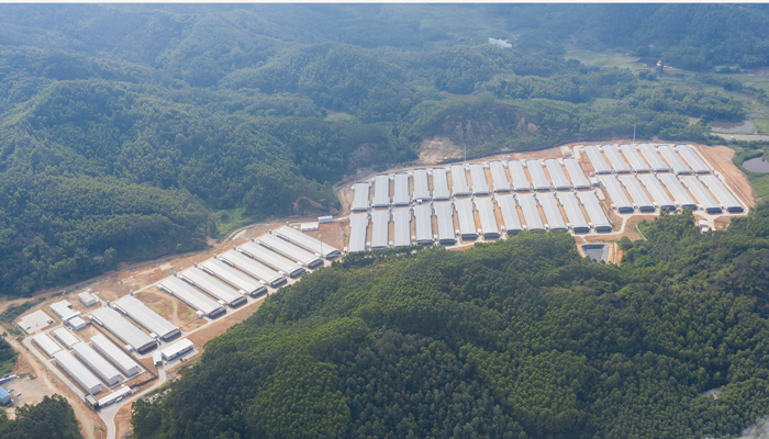 温氏布辰养殖小区占地面积约440亩,建有45幢轻钢结构的自动化养殖栏舍。每栋栏舍建有四层八列H笼养设备,配套自动喂料、自动送水、自动清粪系统,同时对温度和空气质量进行监测,保证肉鸡在舒适的环境下生长,实现绿色、安全、智慧、节约、高效生产。