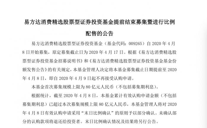 易方达消费精选基金首次募集规模上限为80 亿元 ,易方达基金当晚已出公告比例配售: