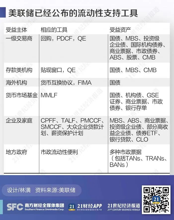 因此,美联储承担起最后贷款人的角色,再度启用次贷危机时发挥重要作用的特殊流动性支持工具,将部分风险资产纳入合格抵押品范围,帮助修复企业和居民的资产负债表。美联储在3月中旬启用的工具中,CPFF(商业票据融资支持工具)、PDCF(一级交易商信贷支持工具)和MMLF(货币市场共同基金流动性便利工具)的可抵押资产,已基本涵盖了融资压力较大的股票、商业票据、企业债和市政债券。