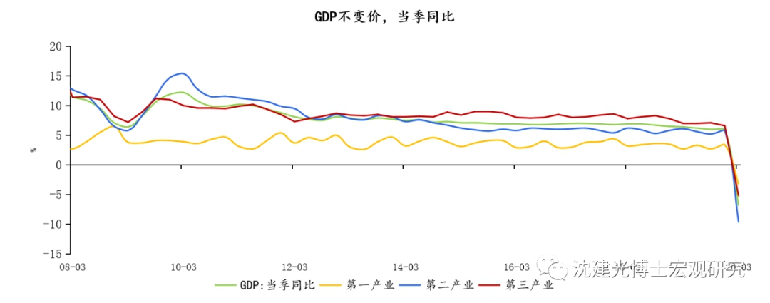 中国经济在一季度出现大幅的负增长,GDP同比下降6.8%。其中,第一产业下降幅度较小,第二产业下降最多,第三产业下降幅度明显好于第二产业。众所周知,餐饮、旅游等行业受疫情冲击较大,为什么第三产业的表现反而比第二产业好呢?主要原因在于金融业,金融业基本维持6%的增长,且在第三产业中的占比非常高。除此之外,互联网等一些很重要的服务领域,也依然维持正增长。