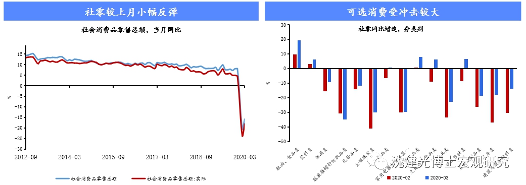 消费受疫情影响较大。虽然3月份社零较1-2月有所回升,但下降幅度仍然达到16%。与此同时,消费细分品类中只有食品、饮料为正增长,整个一季度“最惨”的是汽车、金银珠宝、家用电器等品类。