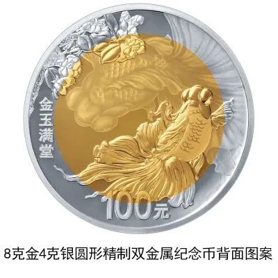 8克金4克银圆形双金属纪念币背面图案为金鱼与海棠花等组合图案,并刊“金玉满堂”字样及面额。