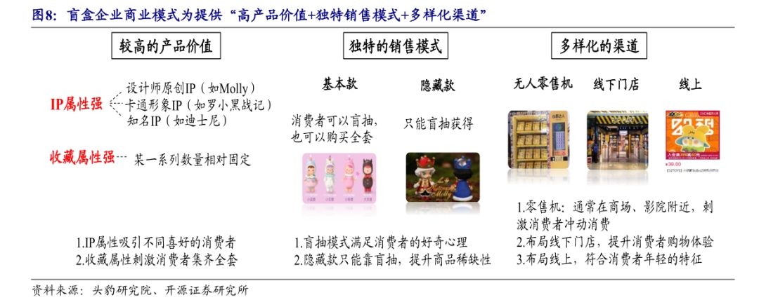 开源证券总结称,简单来说,盲盒的核心商业模式就是对“不确定游戏”的完美复制,即通过强 IP 属性产品吸引消费者,以抽盲盒独特销售模式激发好奇心,并通过抓住消费者对收藏的喜好来提升复购率。