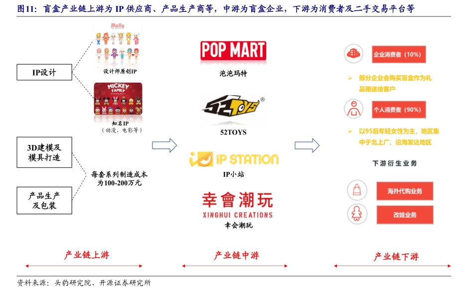根据开源证券的梳理,上游主要为 IP 供应商、模具提供方及产品生产商,其中盲盒企业能够持续与优质IP 供应商合作也是其重要核心竞争力;IP 供应商主要包括原创设计师以及知名IP,盲盒企业通常采用买断或分成的方式与其合作。