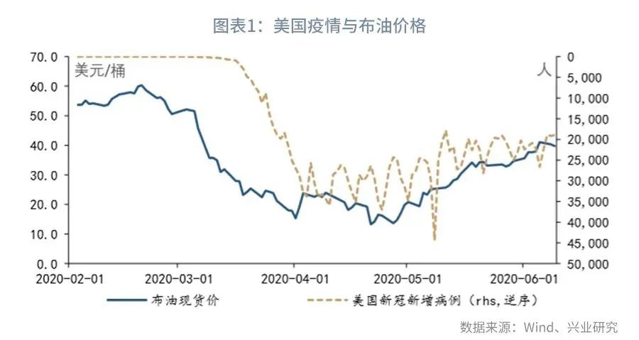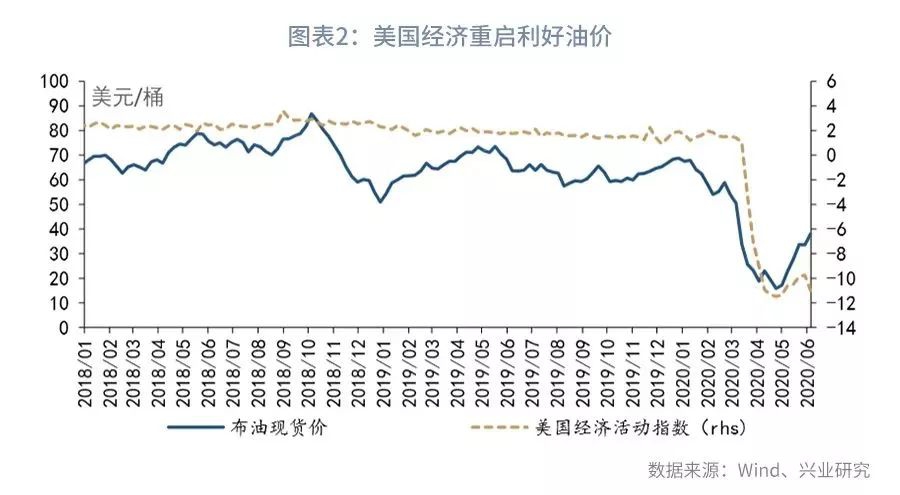 5月,以原油为代表的大宗商品价格出现回暖。一方面,5月美国新冠疫情新增病例开始波动下降,带动市场风险偏好改善;另一方面,5月美国各州先后放松疫情防控措施,线下消费等经济活动“重启”,促使原油需求回升。纽约联储发布的美国经济活动指数已经在4月最后一周触底,5月以来这一指数小幅回升,反映美国国内经济活动正在逐渐恢复。