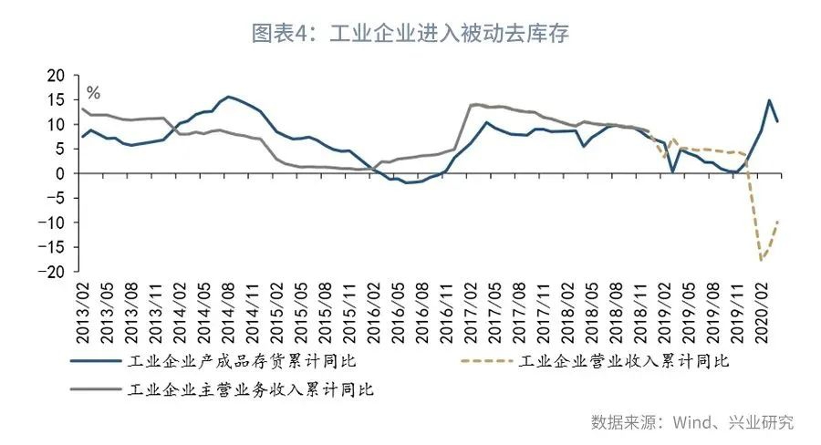 展望未来,5月的PPI同比可能已经是年内的低点,此后PPI同比有望上升。一方面,经历了疫情期间的急速补库存后,工业企业已经进入了被动去库存的阶段:4月工业企业营业收入降幅收窄,而产成品存货增速开始拐头向下。5月PMI数据也显示,制造业新订单PMI继续回升,但产成品库存PMI出现下降。当工业企业进入被动去库存阶段之后,工业品价格下降的压力将减轻。