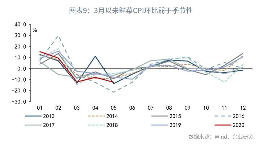 另一方面,受疫情影响,餐饮消费恢复缓慢。5月8日国务院联防联控机制发布会上,商务部副部长表示:“据有关机构监测,‘五一’期间,全国餐饮、住宿行业消费复苏指数比今年清明假期分别提升18和15个百分点,消费规模已恢复至去年同期70%左右,比今年清明假期提升约20个百分点。”由此来看,5月餐饮消费同比可能延续负增长。餐饮消费低迷导致食品价格表现弱于季节性。3月以来鲜菜CPI环比均低于历史同期的平均水平。