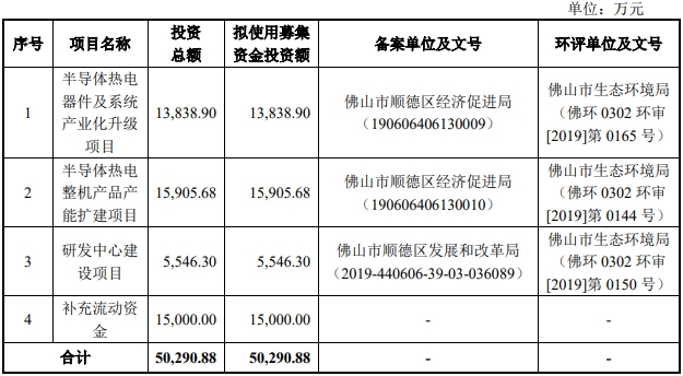 此次冲刺科创板,富信科技拟公开发行股票不超过2,206万股,合计募资5.03亿元,计划用于投资半导体热电器件及系统产业化升级项目、半导体热电整机产品产能扩建项目、研发中心建设项目、补充流动资金。