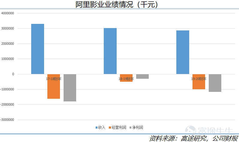 目前阿里文娱主要包括阿里影业、优酷土豆、大麦网等多个实体,但基本都缺乏在内容制作上的相关能力。阿里影业规模虽大,但业务主要是宣发和淘票票,2020财年(19年3月-20年3月)更是由于疫情影视业遭遇寒冬,营收同比下降5%为28.75亿元,净亏损更是从2.54亿元扩大至11.51亿元,同比扩大超过3倍。
