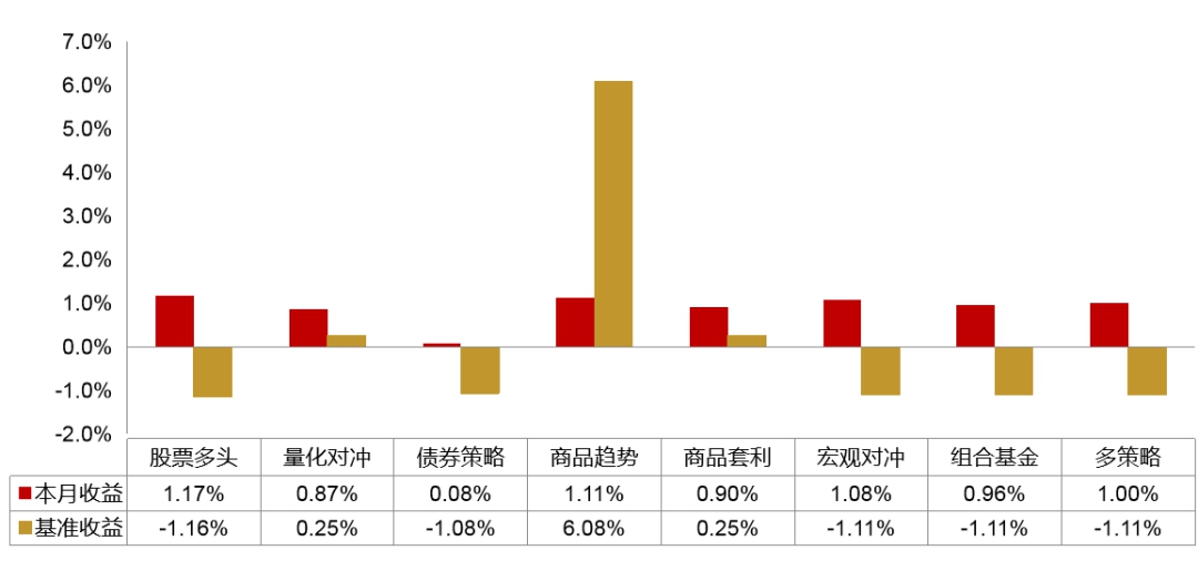 各策略组合方面,股票多头伴随A股市场稳步回升表现出优秀的主动管理能力;量化对冲受益于市场波动及贴水加大,超额收益较高;债券基金在债市情绪较弱的环境下整体收益相对稳健;CTA策略受商品价格大幅反弹影响整体延续高收益特征;多资产策略发挥策略配置优势。