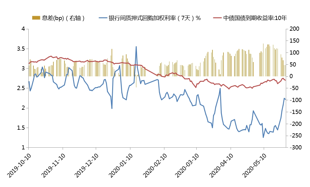图5:10年期国债收益率与回购利率(截至2020/05/29)