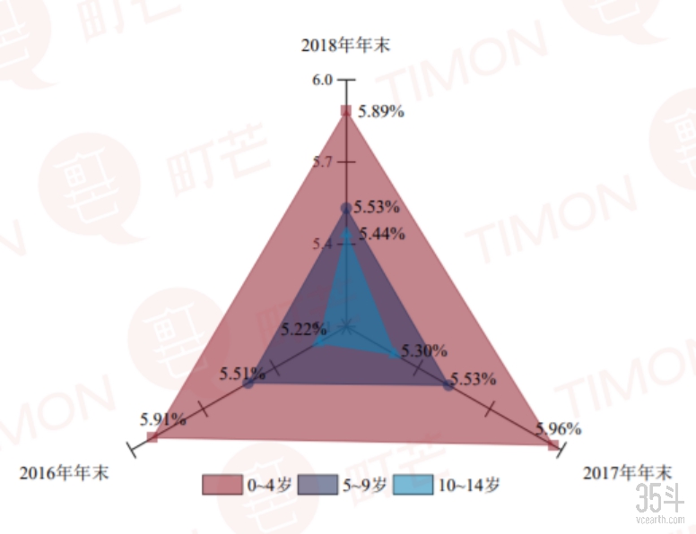 根据我国人口统计年鉴数据显示,2018年底,我国0~4岁、5~9岁、10~14岁的儿童人口分别占总人口的5.89%、5.53%、5.44%,0~14岁儿童人口总数量为2.35亿。