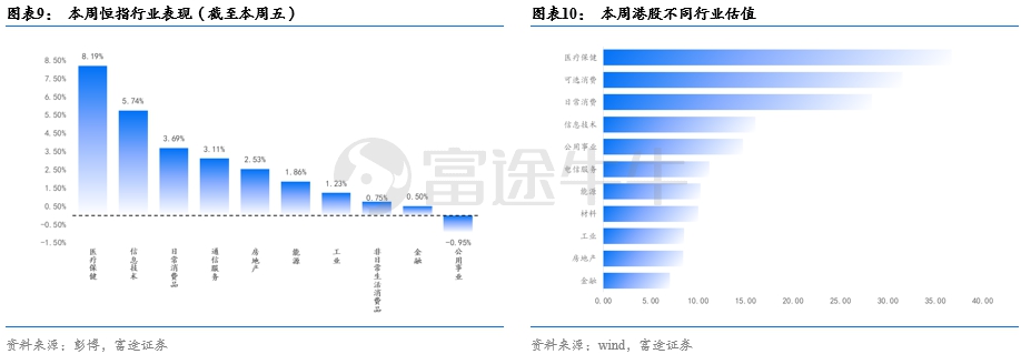 港股行业方面,表现最佳的行业分别为医疗保健、信息技术、日常消费品,分别录得8.19%、5.74%和3.69%的涨幅。此外,估值方面医疗保健板块位列榜首,其次是可选消费和日常消费。