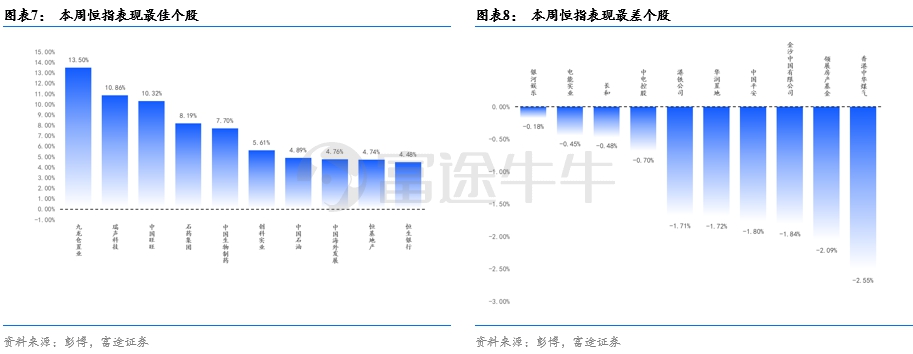 本周恒指成分股中,表现最佳的个股分别为九龙仓置业13.5%、瑞声科技10.86%、中国旺旺10.32%。表现最差的个股分别为香港中华-2.55%、领展房产基金-2.09%、金沙中国有限公司-1.84%。