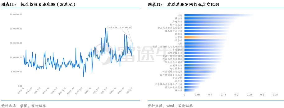 本周,恒指成交额为6199.52亿港元,略低于上周的成交额6386.68亿港元。全市场卖空比例达16.50%,板块卖空比例占前三的是银行、保险Ⅱ、房地产Ⅱ,分别为26.66%、20.78%、19.44%。