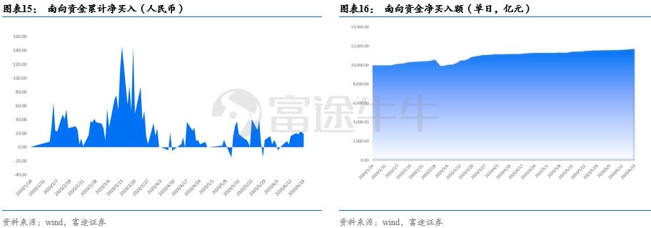 资金流向方面,本周,南向资金累计成交净流入102.38亿元(人民币),较上周40.32亿元(人民币)的资金流入水平大幅增加。其中,沪市港股通净流入45.87亿元(人民币),远高于上周-2.28(人民币)的净流出水平;深市港股通净流入则为56.51亿元(人民币),较上周42.60亿元(人民币)的净流入水平呈较大幅度上升。