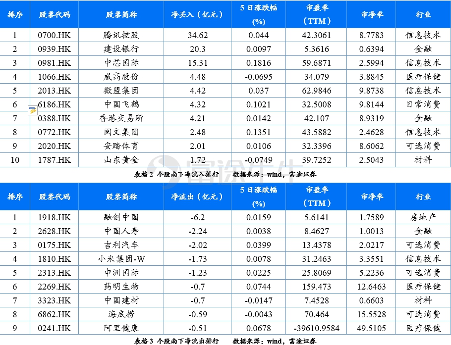港股通板块个股方面,从南下资金买入及卖出活跃程度的维度来看,本周,信息技术、金融和日常消费等板块交投较为活跃,净买入居前三的个股分别为腾讯控股、建设银行、中芯国际,净卖出居前三的分别为融创中国、中国人寿和吉利汽车。