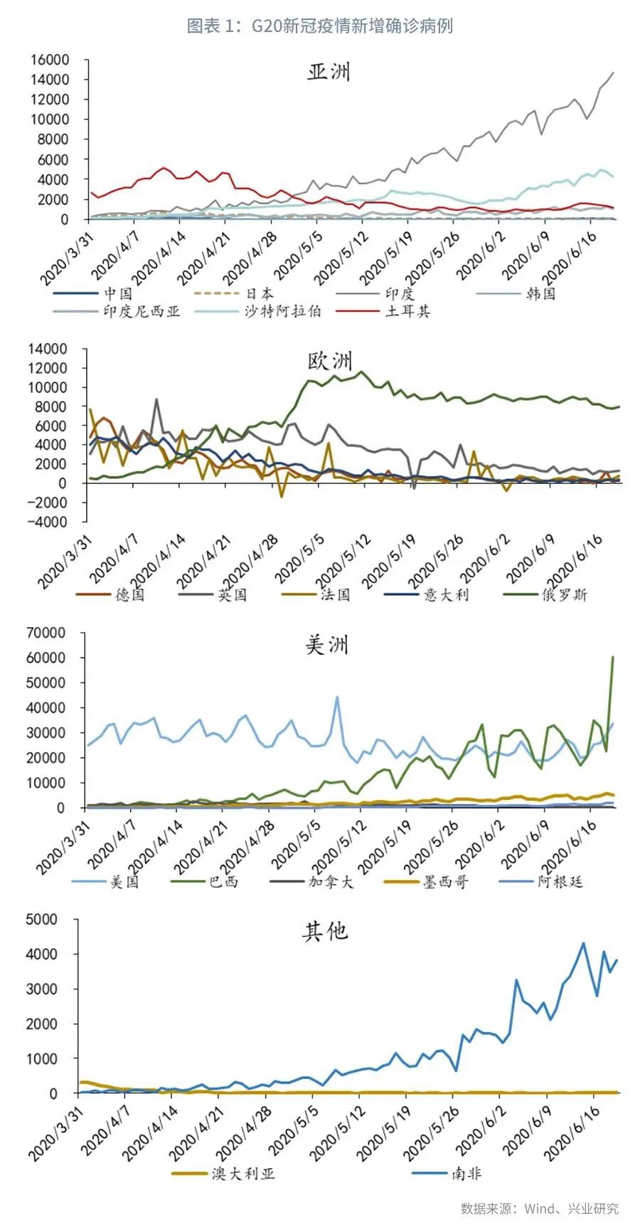 全球疫情出现不同程度反复。亚洲地区,本周国内新增病例193例,印度疫情仍未得到有效控制。欧洲地区,俄罗斯新增确诊仍保持在8000人/日以上,核心欧洲在复工后新增确诊也出现反复。美洲地区,美国新冠肺炎确诊病例仍保持在每日2万人以上,经济重启及最近的骚乱使得新增病例明显增加;巴西疫情继续失控,新增病例保持在每日1.7万人以上,累计确诊突破98万人。