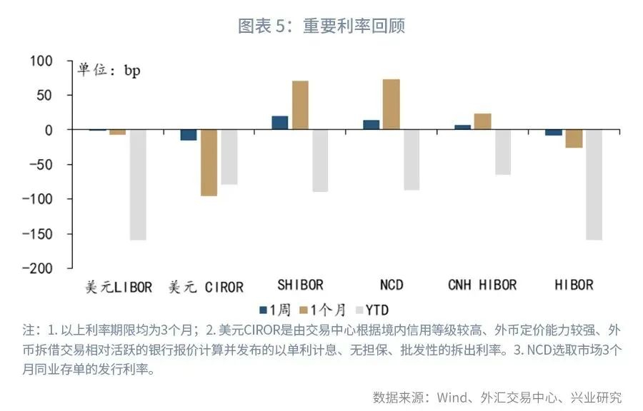 流动性方面,本周3个月LIBOR下行0.7bp,CIROR下行15bp,不过在掉期市场上基差略有走高,显现出美元流动性略有紧张的迹象。本周央行累计开展3000亿逆回购和2000亿中期借贷便利操作,4200亿元逆回购到期,公开市场本周净回笼1200亿元。3个月SHIBOR和NCD分别上行19.1bp和13.78bp,境内流动性边际收紧。