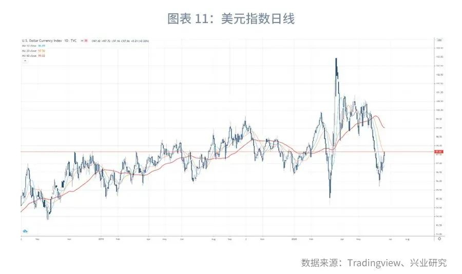 在近期经济暂时企稳的背景下,美联储并未释放进一步加码宽松的信号(负利率或YCC),使得金融市场的投机热情有所降温。同时美国疫情反复、持续骚乱以及居高不下的新增失业都给经济复苏前景蒙上了阴影,近期市场可能会表现出一定的犹豫。投机热情的消退会给予美元指数一定支撑,非美货币将阶段性承压。美元指数短线或反抽98.5至99水平。