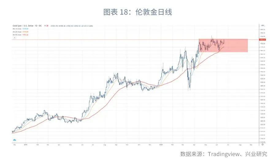 本周大部分时间贵金属窄幅震荡,周五随着美股震荡走低,贵金属收高,伦敦金重新站上1740美元/盎司。不过贵金属的驱动依然不明确。若是市场对于疫情二次爆发的担忧持续发酵,则股市下跌会拖累商品价格,进而抵消美债名义收益率走低。目前看来伦敦金仍会在1670至1750美元/盎司的宽区间内长时间横盘。