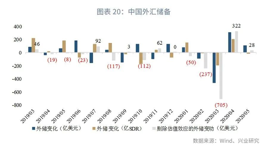 2020年5月,以SDR计价,我国外汇储备22607亿SDR,环比下降18亿SDR,前值上升199亿SDR;以美元计价,我国外汇储备31017亿美元,环比上升102美元,前值上升308亿美元。2020年5月美元指数小幅下跌,全球债券收益率小幅下行贡献了正向估值效应,剔除估值效应后,外储实际上升28亿美元。外管局在答记者问中指出“我国经济潜力足、韧性强、回旋空间大、政策工具多的基本特点没有改变,将继续支持外汇储备规模总体稳定”,外储或回归低波动时期。