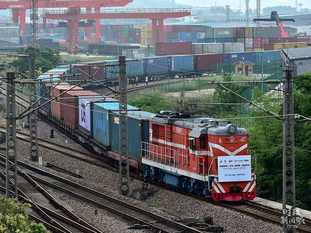 △6月5日,满载防疫物资的中欧班列在浙江义乌西站启程,经由新疆阿拉山口口岸出境,前往西班牙首都马德里。