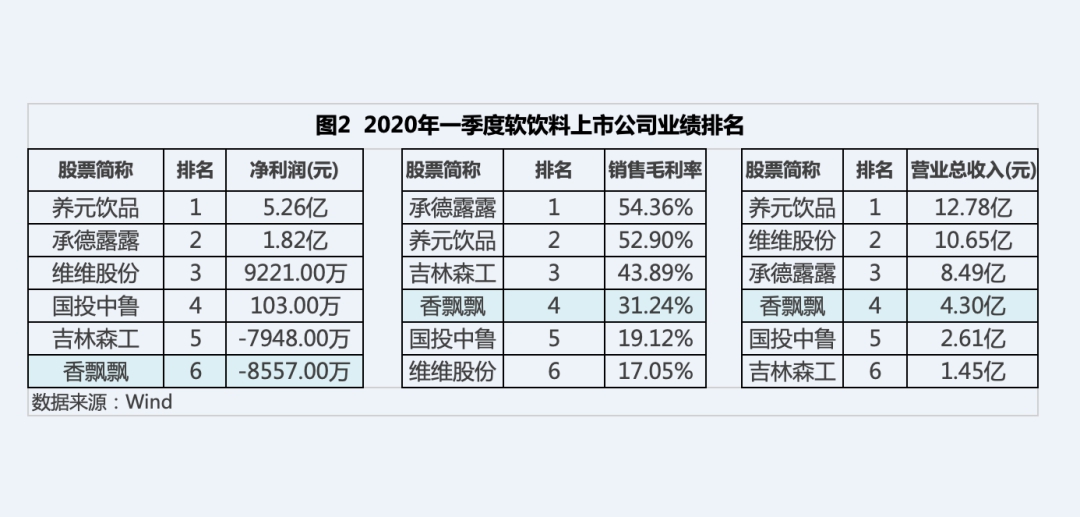 据同花顺,参考2020年一季度软饮料上市公司业绩排名(见图2),香飘飘在净利润方面表现较差。