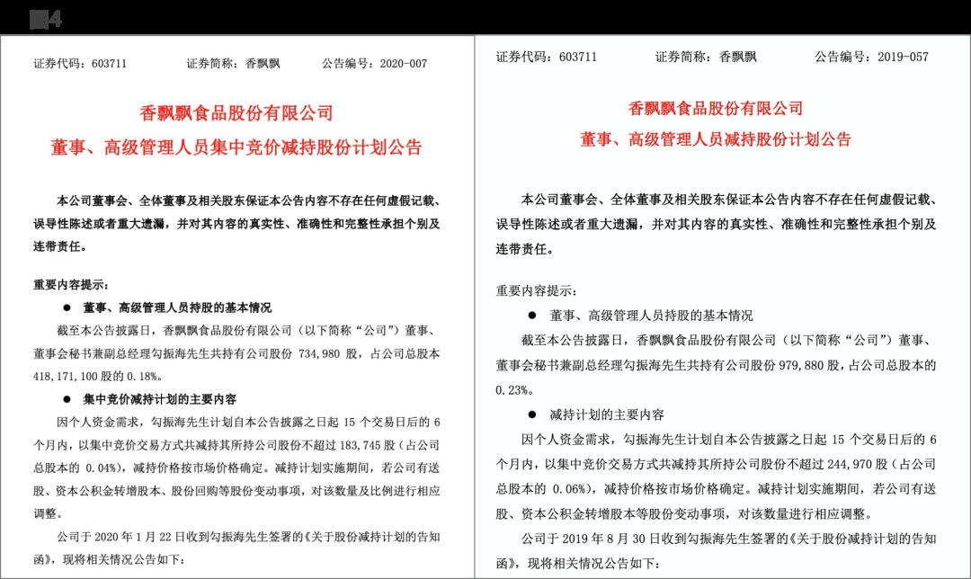 近日,“香飘飘35天4名高管离职”的新闻引发业内热议,据Wind数据,股东、前董事会秘书兼副总经理勾振海两次减持套现离职。监事冯永叶、俞琦密以及公司董事兼副总经理、蒋建琪的“左膀右臂”、在香飘飘任职长达15年的第六大股东蔡建峰也辞职,值得关注的是,据Wind数据,蔡建峰是蒋建琪家族之外,持股数量最多的股东,前五大股东分别为蒋建琪(56.42%),蒋建斌(8.61%),宁波志同道合投资管理合伙企业(8.36%,法定代表人、疑似实控人陆家华)、陆家华(6.89%),蒋晓莹(4.3%,蒋建琪、陆家华之女)。