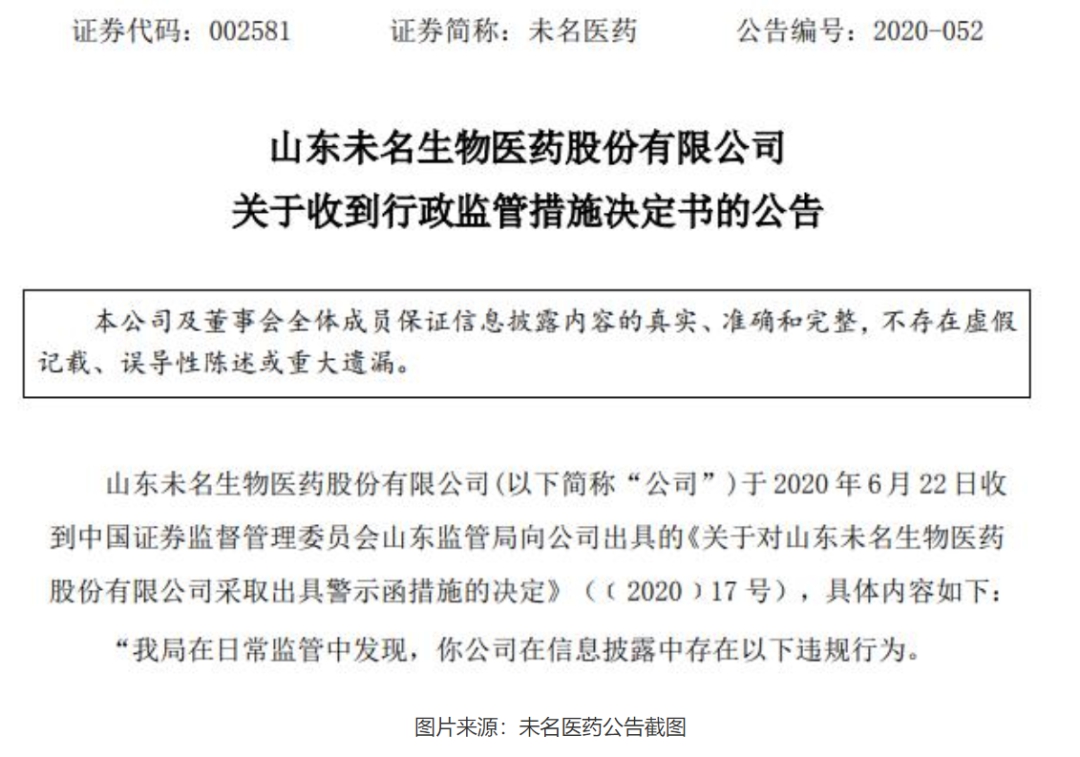 6月22日,未名医药还收到山东证监局出具的警示函,指出未名医药在信息披露中存在数项违规行为,山东证监局决定对其采取出具警示函的监管措施,并将相关情况记入证券市场诚信档案。