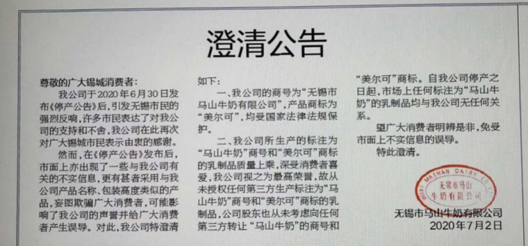 随后,马山牛奶公司在当地纸媒发布澄清公告,公司股东也从未考虑向任何第三方转让“无锡市马山牛奶有限公司”的商号和“美尔可”商标。自8月1日停产之日起,市场上任何标注为“马山牛奶”的乳制品均与我公司无任何关系。