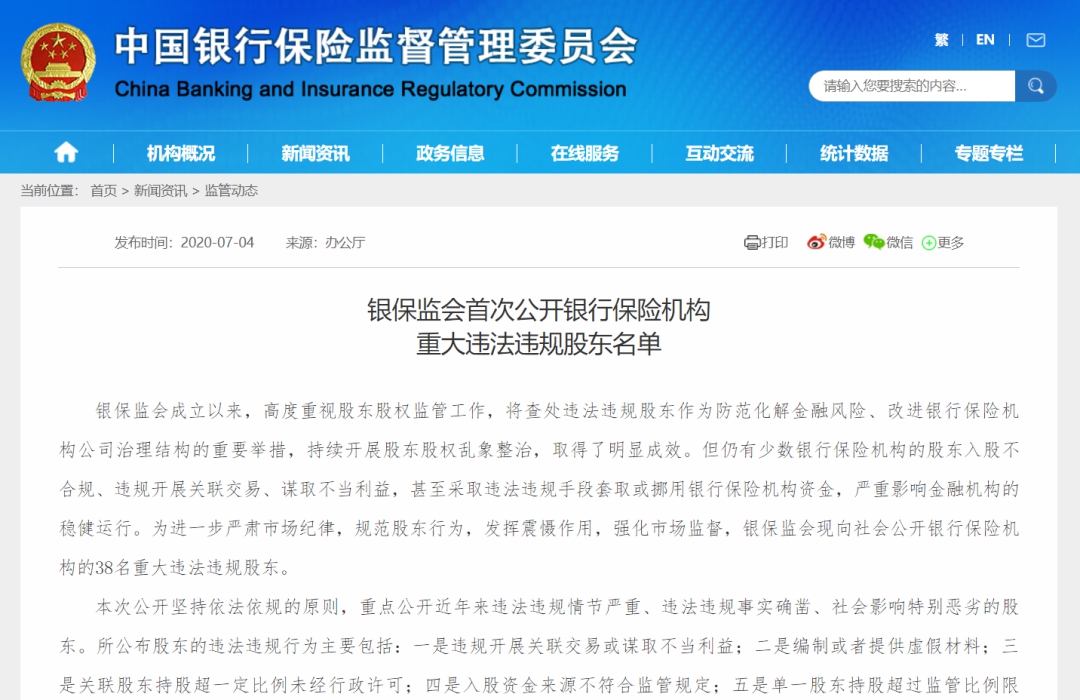 为进一步严肃市场纪律,规范股东行为,发挥震慑作用,强化市场监督,银保监会今天(4日)首次向社会公开了银行保险机构的38名重大违法违规股东。