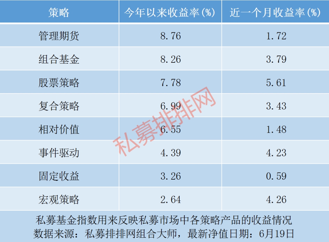 就是在这样的市场环境中,抓住结构性机会的私募不在少数。私募排排网数据显示,截至6月19日,八大策略基金全线飘红,更有1441只私募基金年内收益超过30%,其中990只私募基金跑赢创业板指,更有65只私募年内收益翻倍。