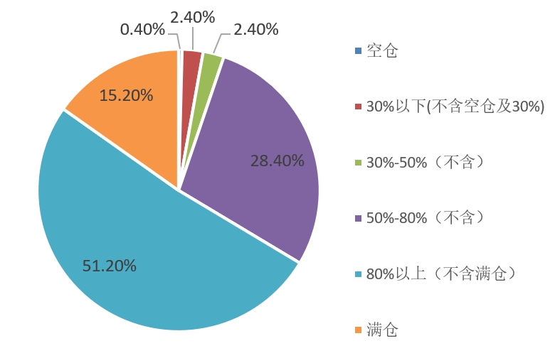 具体来看,仓位在五成及五成以上的私募基金占比高达94.8%,其中更有15.2%的私募目前处于满仓状态,相比上月的13.62%上涨了1.58个百分点,八成以上仓位(不含满仓)的私募占比达51.2%,环比上涨了12.05个百分点,是本月涨幅最大的仓位区间。