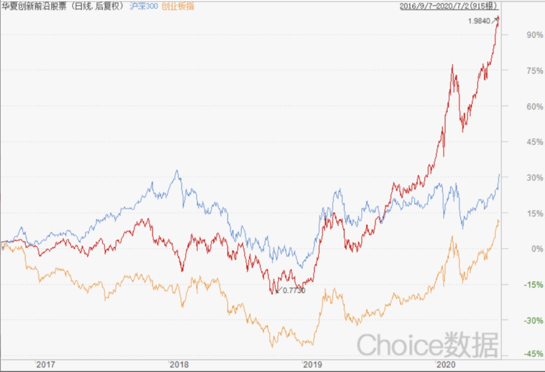 这其中,又有一些产品表现特别突出的,比如华夏创新前沿股票(002980),该基金以长期持续跑赢创业板指数作为主要投资目标。据Choice数据显示,该基金在今年上半年的涨幅为48.06%,大幅超越了创业板指超10个百分点。