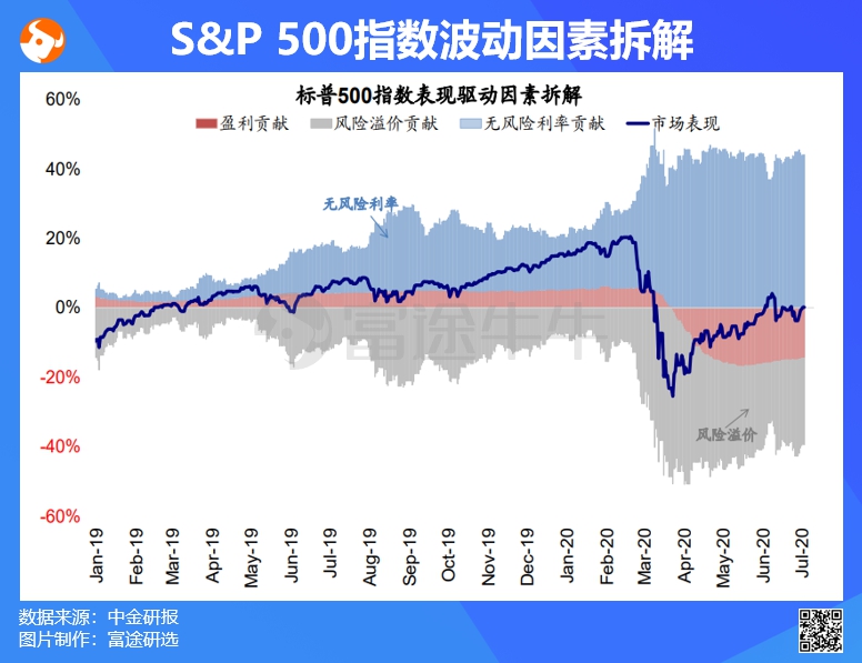 今年第二季度,标普500指数成为自1998年以来表现最佳的季度,飙升了近20%,较3月份的低点迅速反弹。相对市场的跑赢程度取决于流动性环境,拆解其反弹的因素,主要得益于风险溢价收敛。
