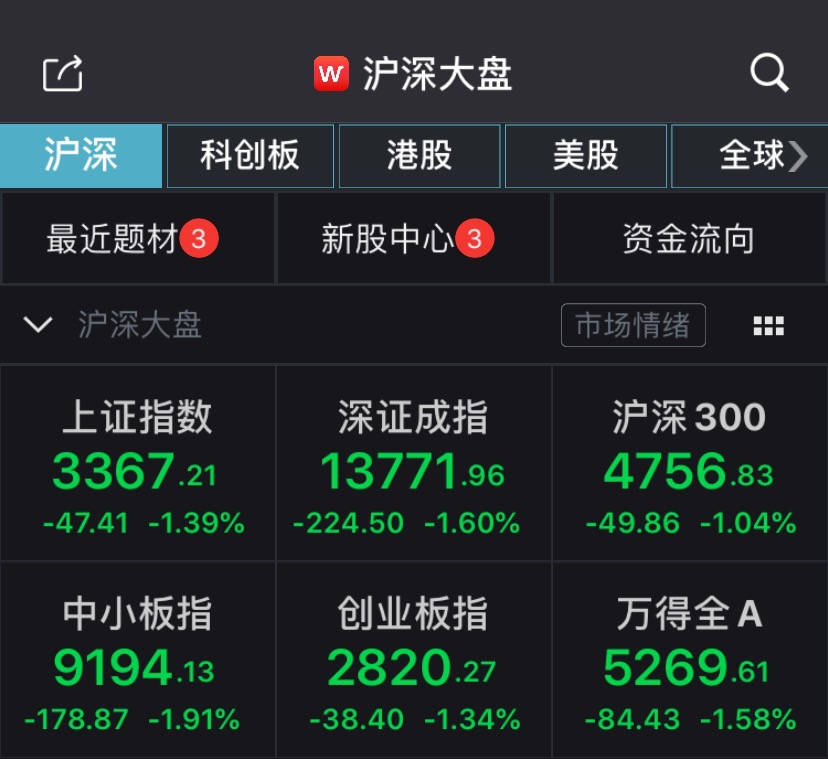 7月15日早盘,A股大盘延续上一交易日的回调态势。Wind数据显示,截至午间收盘,上证指数、深证成指、创业板指分别跌1.39%、1.60%、1.34%。