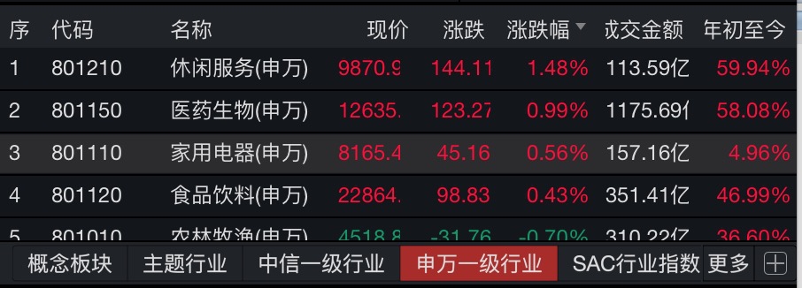 Wind数据显示,截至午间收盘,申万一级行业板块中,仅有休闲服务、医药生物、家用电器、食品饮料板块上涨,均属大消费范畴。