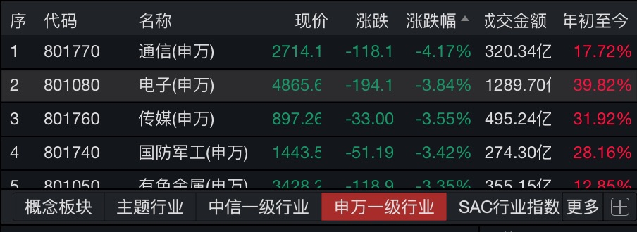 另外,科技股今日重挫。截至午间收盘,通信、电子板块跌幅居前。