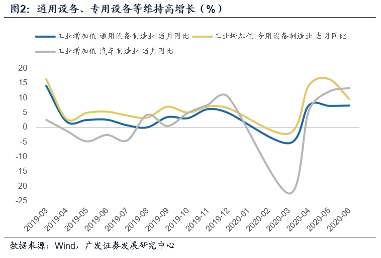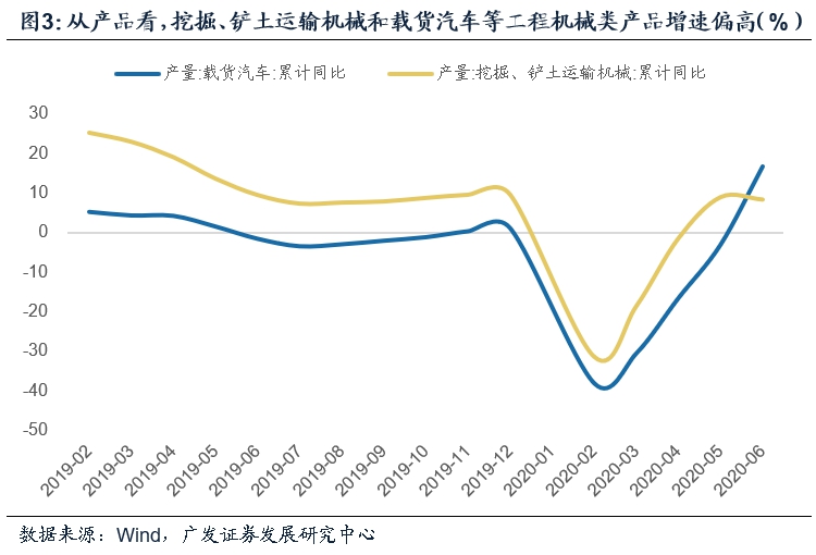 二是通用设备、专用设备、载货汽车、水泥等维持高增长,挖掘、铲土运输机械和载货汽车上半年产量增速分别为16.7%和8.4%,这一点继续验证建筑业开工的活跃。通用设备增加值同比为7.4%,基本持平于过去两个月;专用设备同比为9.6%,低于前值但仍属偏高增长。汽车业增加值同比为13.4%,继续抬升。从产品看,挖掘、铲土运输机械和载货汽车等工程机械类产品增速偏高。