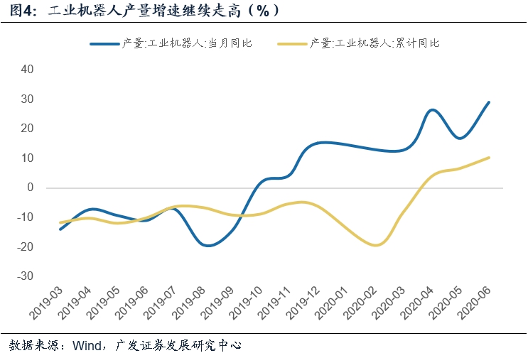 3)工业机器人产量增速继续走高,月增速已近30%,上半年累计增速10.3%,如我们前期指出,疫情后“龙头企业加快产能升级和企业自动化进程”。
