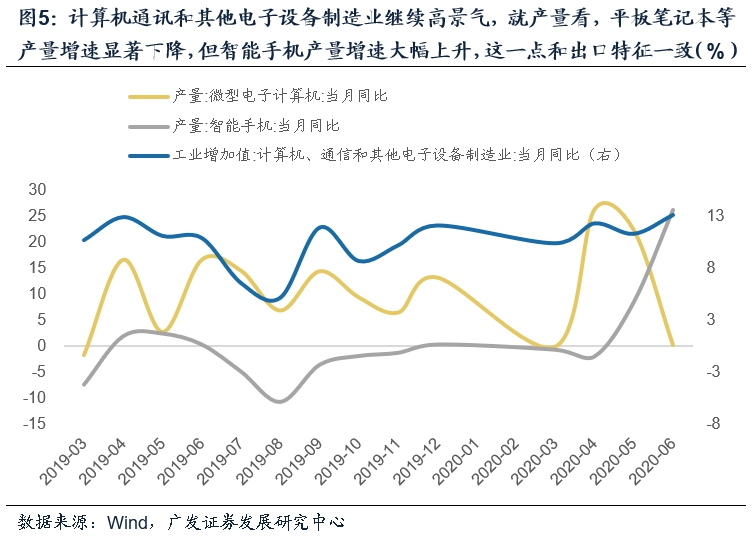 4)计算机通讯和其他电子设备制造业继续高景气,就产量看,平板笔记本等产量增速显著下降,但智能手机产量增速大幅上升,这一点和出口特征一致。