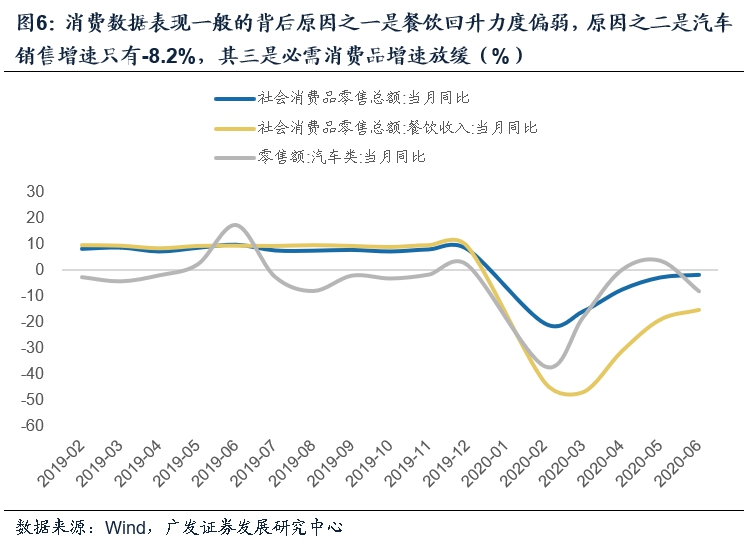 消费数据表现一般的背后原因之一是餐饮回升力度偏弱,6月餐饮收入增幅依然只有-15.2%。我们理解当月新发地疫情在很大程度上影响了服务类消费的回升。