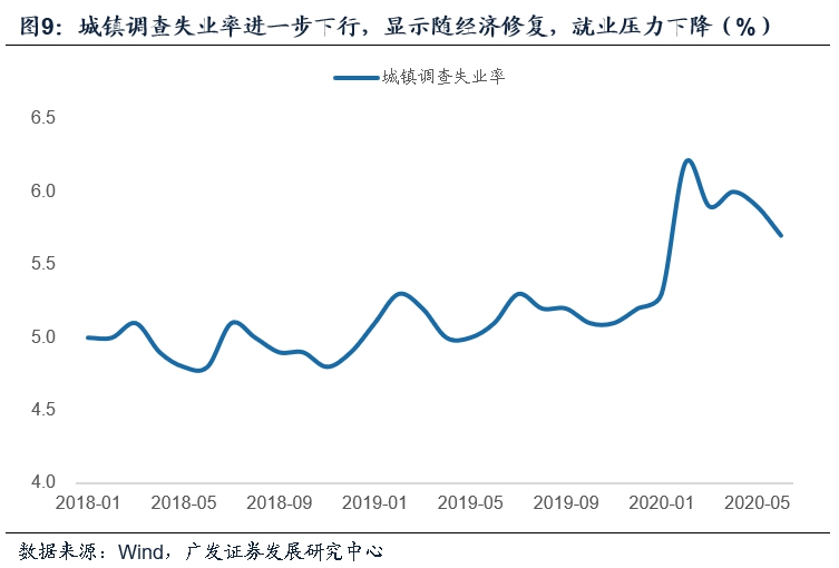 城镇调查失业率进一步下行至5.7%,显示随经济修复,就业压力下降。城镇居民可支配收入增速也较一季度回升,但累计增速只有1.5%,扣除价格因素为负增2.0%。收入效应可能也是同期消费拖累因素之一。